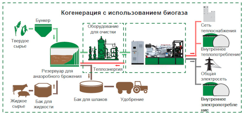 - Использование возобновляемых источников энергии — переработка биогаза из свалок, очистных сооружений и агрокомплексов.