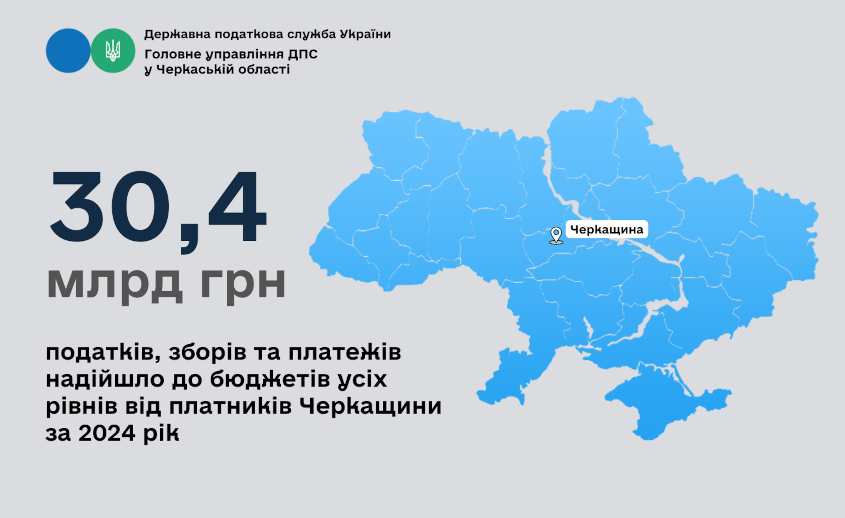 За 2024 рік платниками Черкаської області до бюджетів усіх рівнів сплачено 30,4 млрд грн податків, зборів та платежів, що на 23,6%, або на 5,8 млрд грн, більше порівняно з 2023 року.