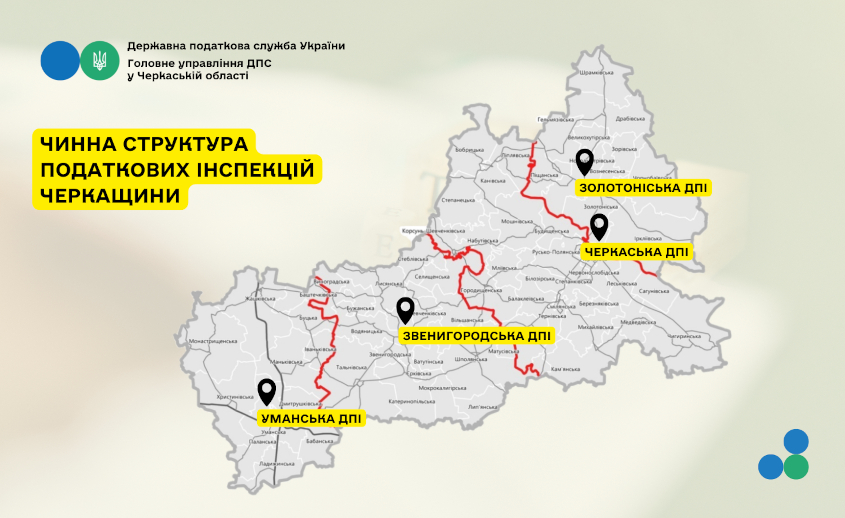 Нагадуємо, що в складі ГУ ДПС у Черкаській області створені та фукціонують 4 державні податкові інспекції – Черкаська державна податкова інспекція, Звенигородська державна податкова інспекція, Золотоніська державна податкова інспекція та Уманська державна податкова інспекція, при яких створено 13 центрів обслуговування платників: