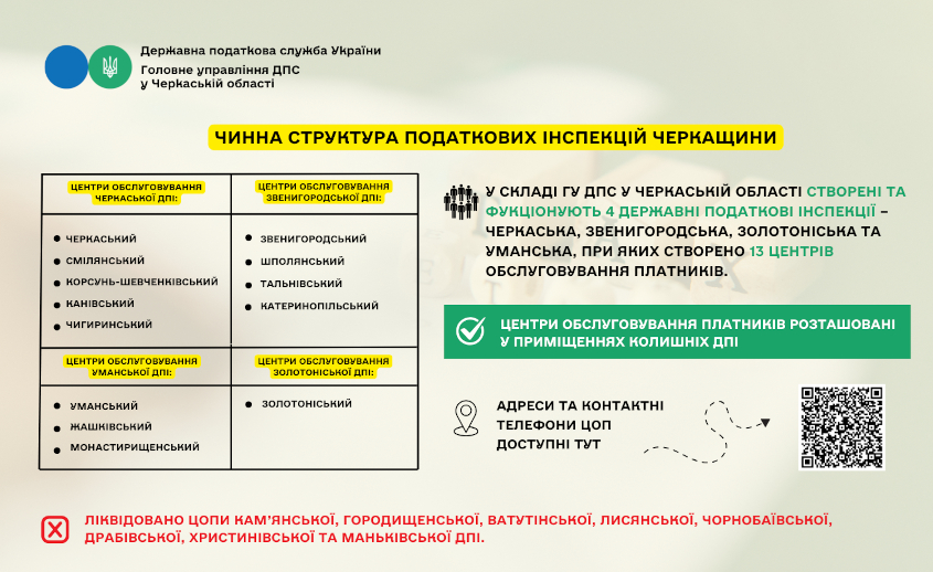 Поряд з цим, Головне управління ДПС у Черкаській області нагадує про ліквідацію центрів обслуговування платників Кам’янської, Городищенської, Ватутінської, Лисянської, Чорнобаївської, Драбівської, Христинівської та Маньківської державних податкових інспекцій Головного управління ДПС у Черкаській області.