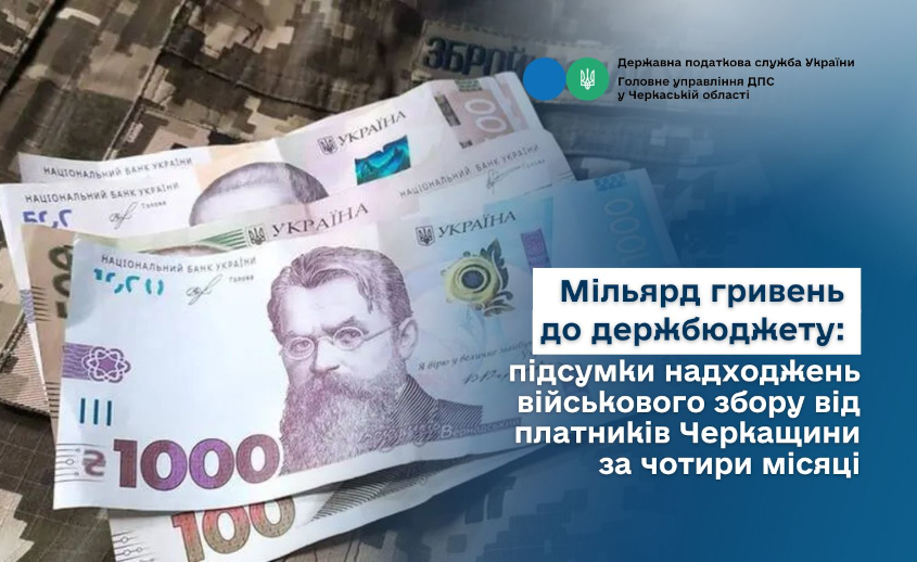 За січень-квітень нинішнього року до державного бюджету надійшло 1 014,6 млн грн військового збору від платників Черкащини. Говорить про це в.о. начальника ГУ ДПС у Черкаській області Тетяна Харьковська. Вона зазначає, що доведений показник виконали на 111,4 %, темп росту до відповідного періоду 2024 року становить 343,6 %, а це плюс 719,3 млн грн.