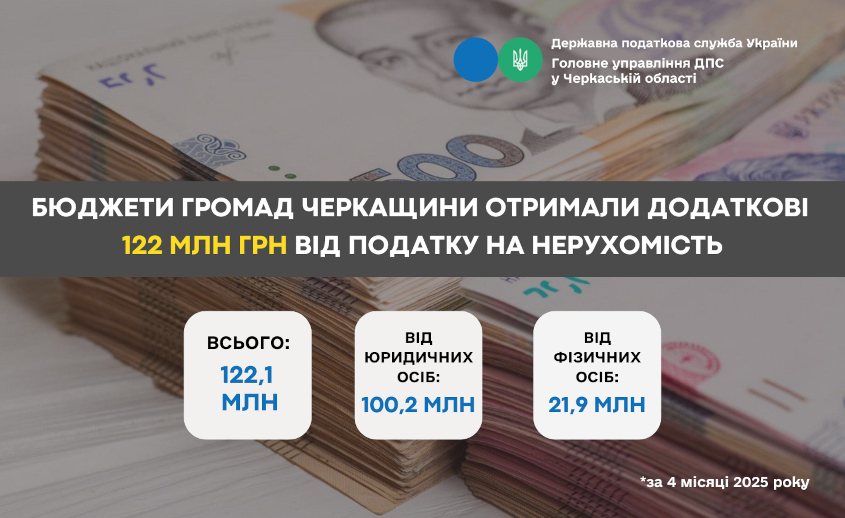 За результатами 4 місяців 2025 року місцеві бюджети області отримали 122,1 млн грн податку на нерухомість. Про це повідомляє виконуюча обов'язки начальника ГУ ДПС у Черкаській області Тетяна Харьковська.