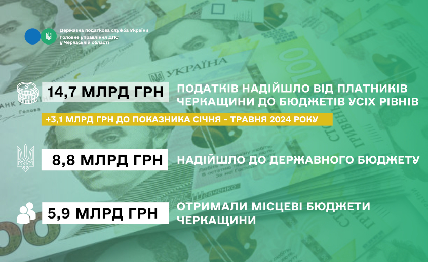 Як зазначає начальниця Головного управління ДПС у Черкаській області Тетяна Харьковська, до державного бюджету сплачено 8,8 млрд грн (на 33,5 % або на 2,2 млрд грн більше показника січня-травня 2024 року). Стосовно місцевих бюджетів Черкаської області, то вони поповнились на 5,9 млрд грн (на 18,7 % або на 0,9 млрд грн більше, порівняно з минулорічним показником січня-травня).