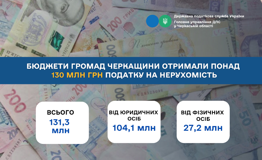 За результатами 5 місяців 2025 року місцеві бюджети Черкащини отримали 131,3 млн грн податку на нерухомість, що на 14,9 % більше, ніж за аналогічний період минулого року. Про це повідомляють в Головному управлінні ДПС у Черкаській області.