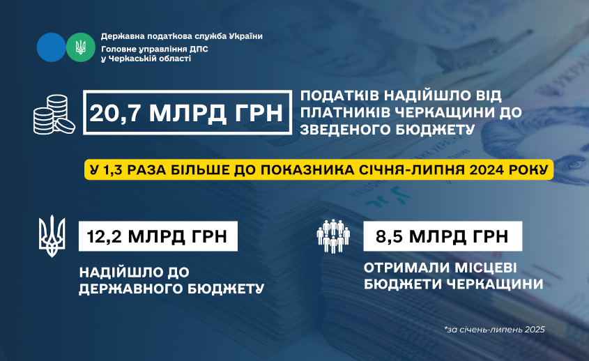 Платники Черкаської області за січень-липень 2025 року сплатили до бюджетів усіх рівнів 20,7 млрд грн податків, зборів та платежів. Начальниця ГУ ДПС у Черкаській області Тетяна Харьковська зазначає, що, порівнюючи з аналогічними показниками минулого року, до бюджетів спрямували на 4,5 млрд грн або в 1,3 раза податків більше.