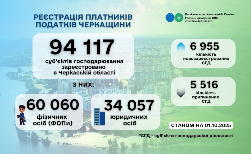 Головне управління ДПС у Черкаській області інформує, що станом на 01.10.2025 на Черкащині зареєстровано 94 117 суб’єктів господарювання, із них: 60 060 фізичних осіб-підприємців та 34 057 юридичних осіб.