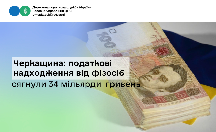 За січень-жовтень 2025 року надходження платежів, контроль за надходженням яких покладено на управління оподаткування фізичних осіб ГУ ДПС у Черкаській області, сягнули 34 млрд грн, що на 6,2 млрд грн, або 22,3 % більше, ніж за відповідний період 2024 року.