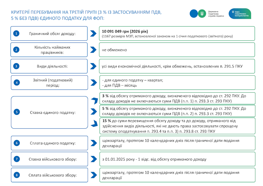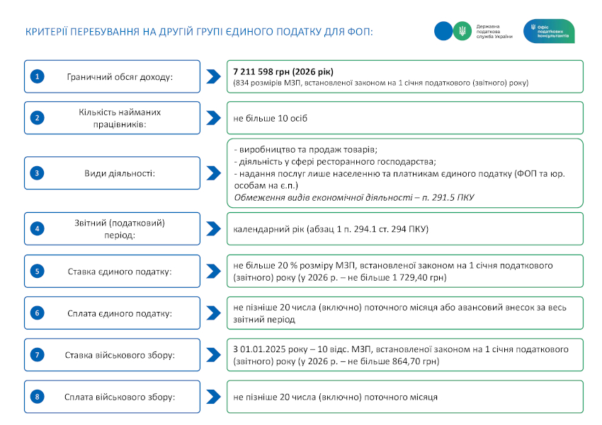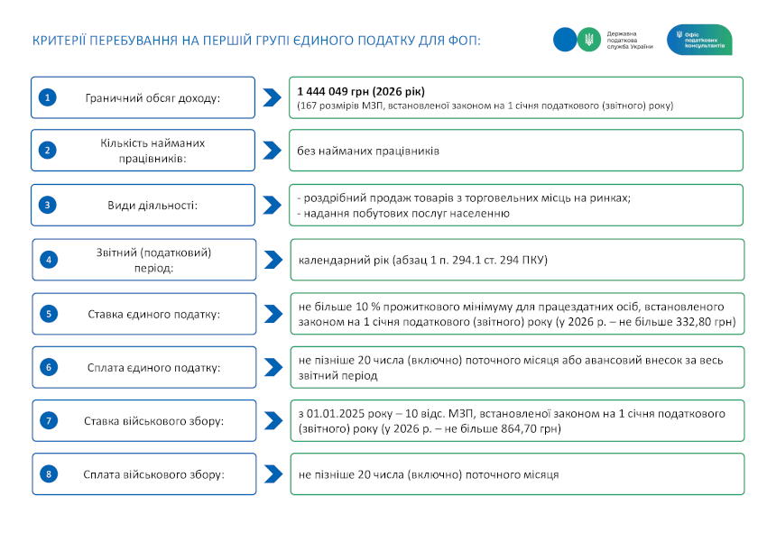 Щоб ви могли легко орієнтуватися у законодавчих вимогах, ДПС підготувала інфографіку щодо критеріїв перебування платників єдиного податку 1-4 груп у 2026 році. Зберігайте та користуйтесь!